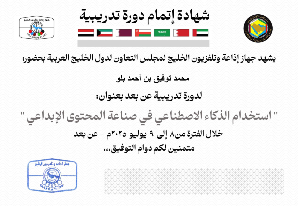 بترشيح من جهاز إذاعة وتلفزيون الخليج لمجلس التعاون لدول الخليج العربية حضرتُ يومي الثلاثاء والأربعاء (8-9 يوليو 2025)، الدورة التدريبية التي نظمها الجهاز عبر الزووم عن استخدام الذكاء الاصطناعي في صناعة المحتوى الإبداعي، قدّمها من مملكة البحرين المدرب ومستشار الاتصال والعلاقات الدولية الأستاذ مهند النعيمي، بحضور نحو 1300 مشارك من الإعلاميين والمؤلفين، وصنّاع محتوى، والمهتمين بالثقافة، والإبداع.