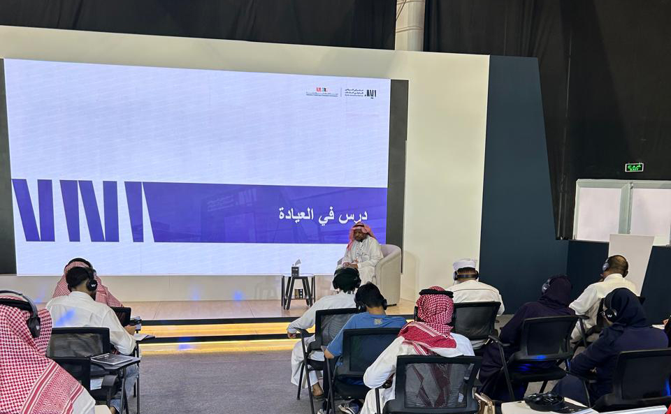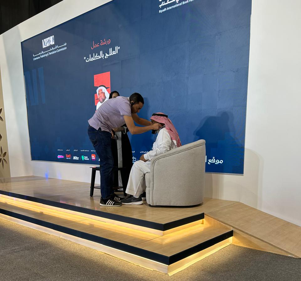 وبعد بضع ساعات توجهنا إلى مقر المعرض في حرم جامعة الأميرة نورة بنت عبد الرحمن الذي كانت تعج طوابيره بمئات من عشاق الكتب. فاُستقبلنا من بوابة كبار الشخصيات آخذين طريقنا إلى القاعة «B» المخصصة للورشة التي كانت تتسع لخمسين شخصًا، وأُعدّت بكل احترافية (ميكروفون لاسلكي، سماعات فردية للحضور، شاشة عرض للشرائح).