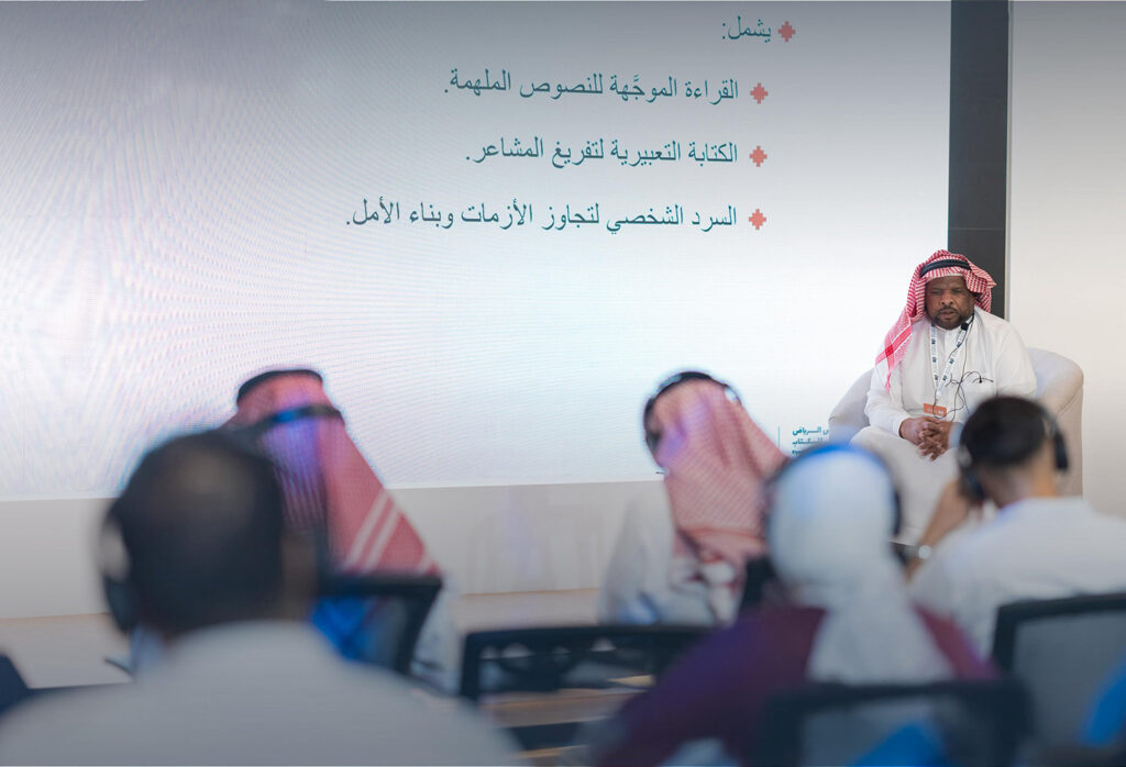 وعلى وقع ذلك الاستهلال الروحاني خيم صمتٌ جميل على القاعة ثم حييت الحضور وقلت: “إنه لمن دواعي سروري أن ألتقي بكم في يوم مبارك لأول مرة في هذه المناسبة السنوية… لمشاركتكم هذه الورشة بعنوان «العلاج بالكلمات». على مدى ساعةٍ من الزمن، سنعيش معًا رحلةً نفسيةً وإبداعية نكتشف من خلالها كيف يمكن للكلمة أن تكون وسيلةً للتعبير والشفاء، وسأخصص في نهايتها وقتًا لتفاعلكم ومداخلاتكم.”.
